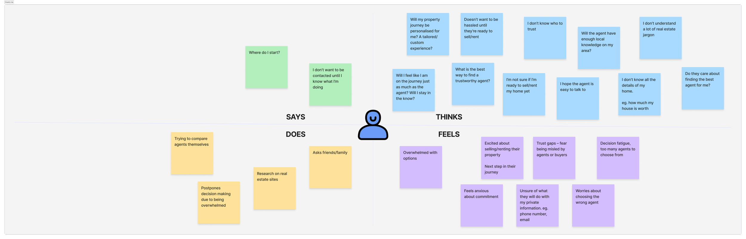 I began by creating an empathy map to synthesise user attitudes and pain points. This was crucial for understanding the emotional state of a homeowner, their fears of being spammed, uncertainty about home value, and need for reassurance before committing.
